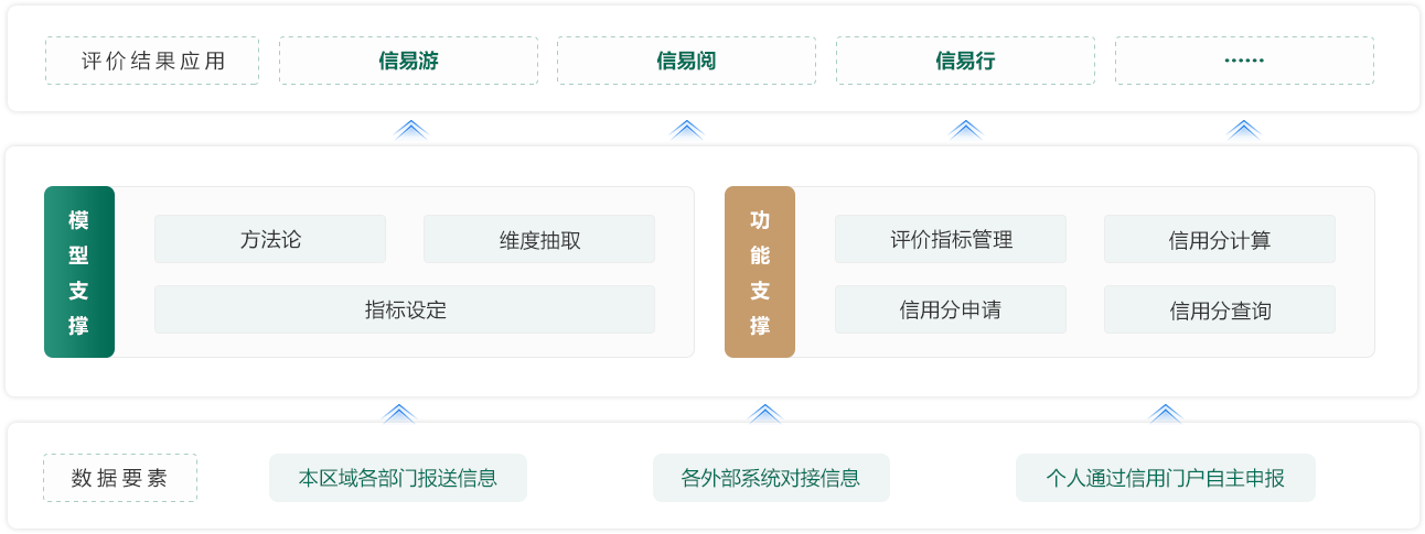 结合地域实际情况, 与清华大学公管学院博导团队联合建模、共同研发,梳理评价适用对象、适用评价维度、评价指标,形成信用评价模型、实现动态信用评价。以个人信用分为基础,推出“信用场景码”的信易+应用模式,结合手机移动端,实现文旅、交通、医疗、商业消费等领域的赋能,完成“信用便民惠企”的初衷。
